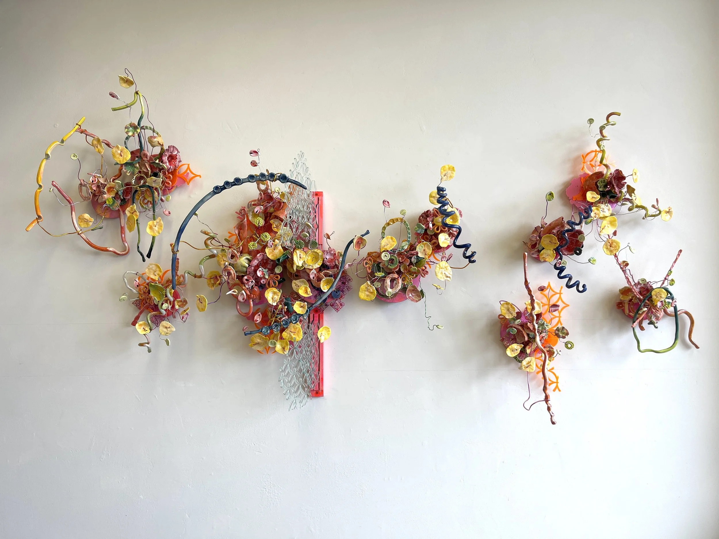 Ceramic, glaze, painted wood, metal brace, wire, plexiglass